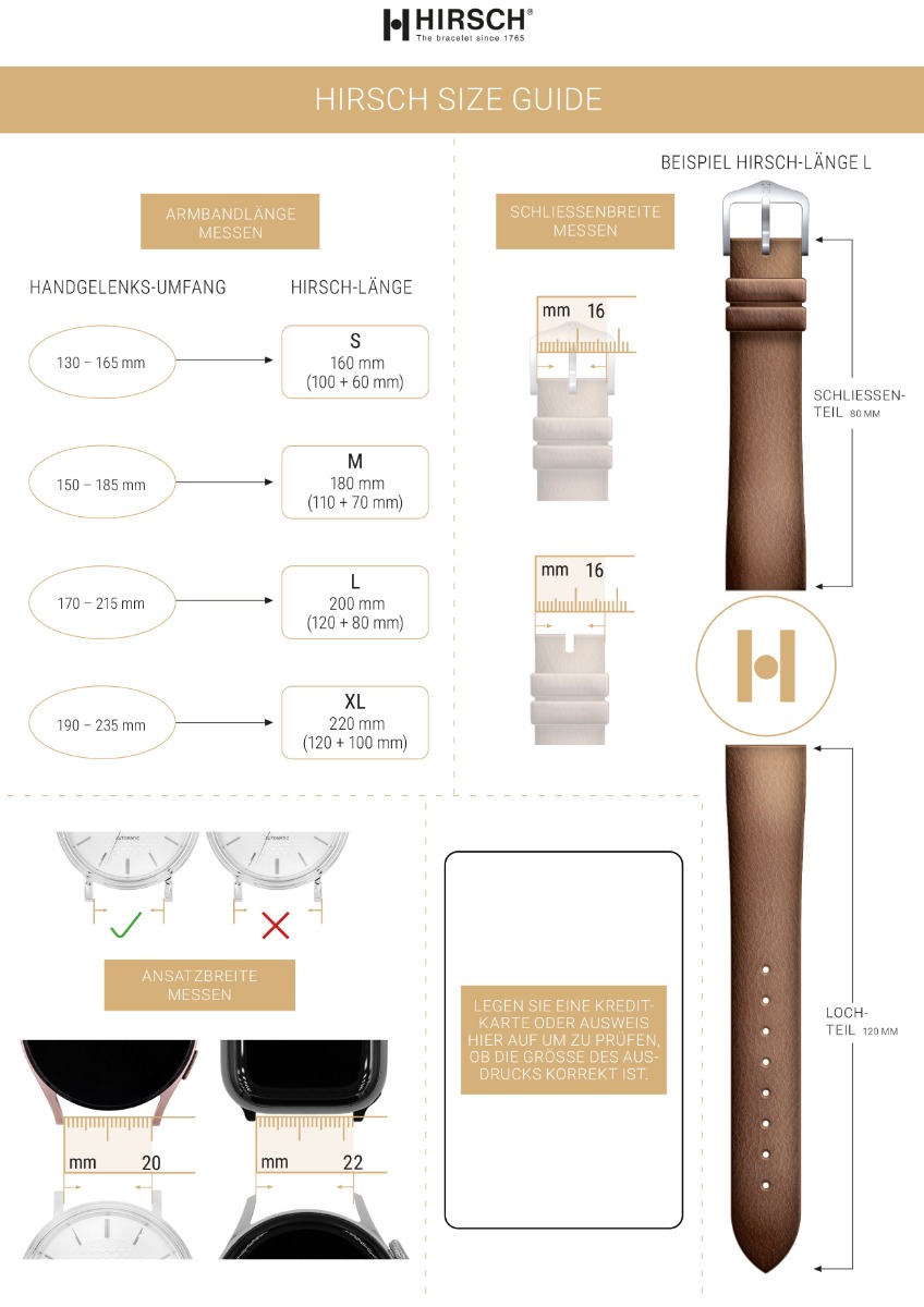 Egal für welches Hirsch Uhrenarmband du dich entscheidest: ob sportlich oder elegant - es muss passen, zu dir und natürlich zu deinem Handgelenk. Eine Uhr ist nämlich erst dann richtig perfekt, wenn sie auch optimal sitzt. Unverzichtbar hierbei: Die richtige Armbandlänge.